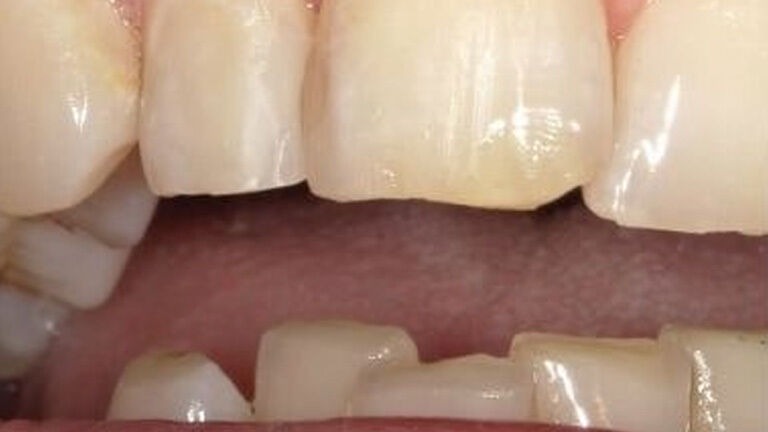 Smile makeover with full ceramic crowns on the upper front six teeth.